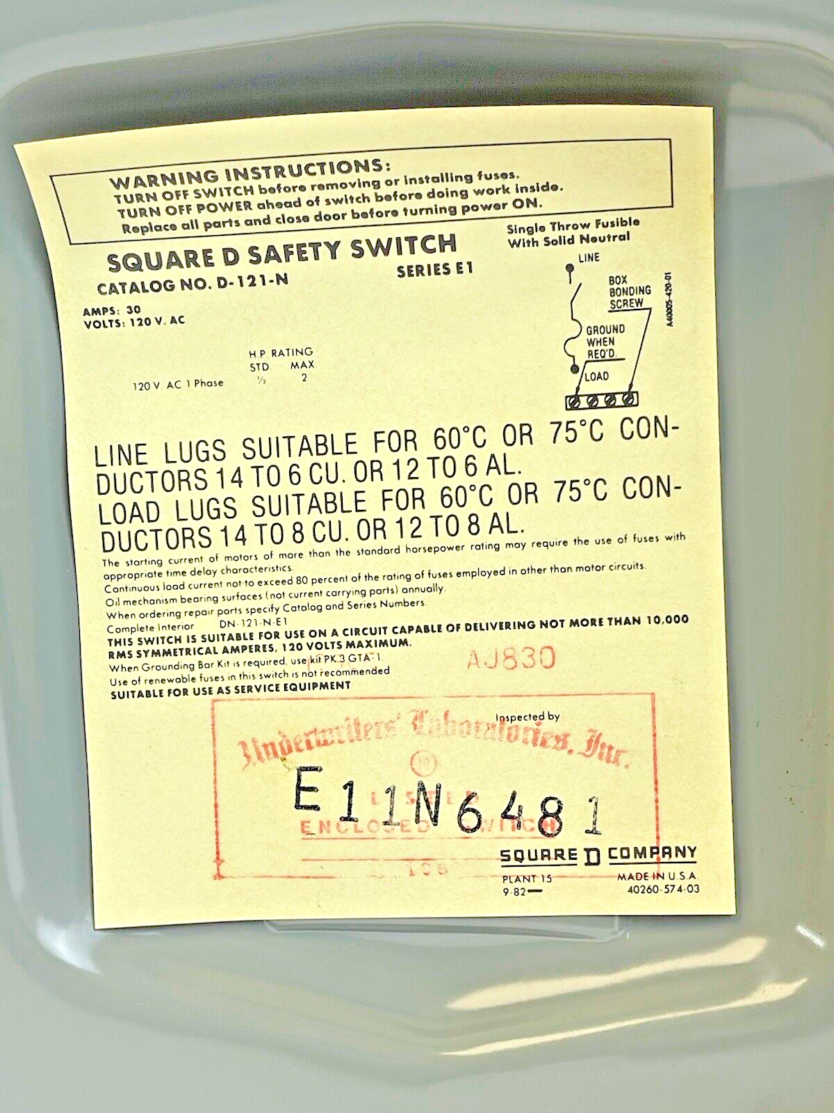 SQUARE D - D-121-N SER. E1 - SAFETY SWITCH - 30 A, 120 VAC, 1 PHASE - NEW
