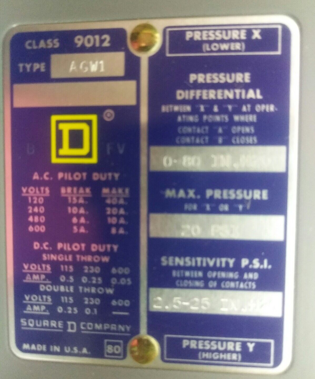 SQUARE D , DIFFERENTIAL PRESSURE SWITCH , 9012, AGW-1, SERIES B