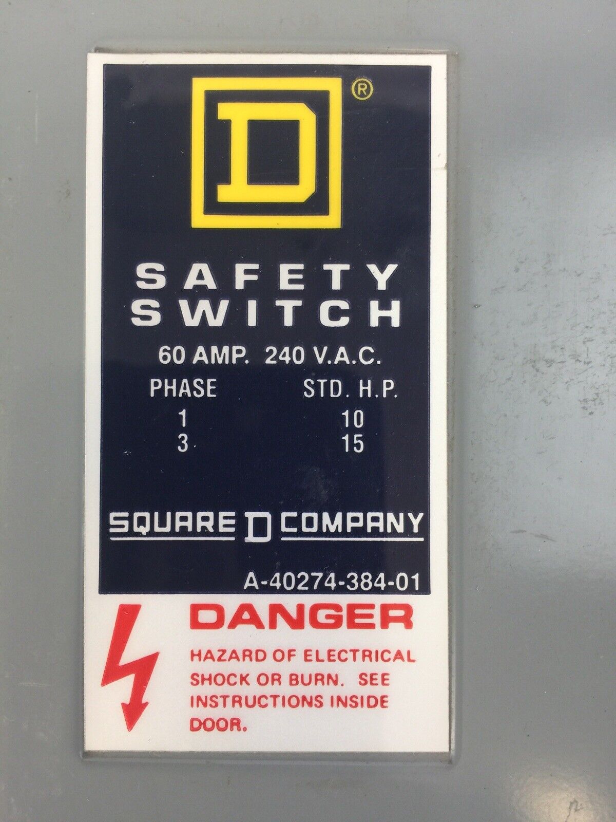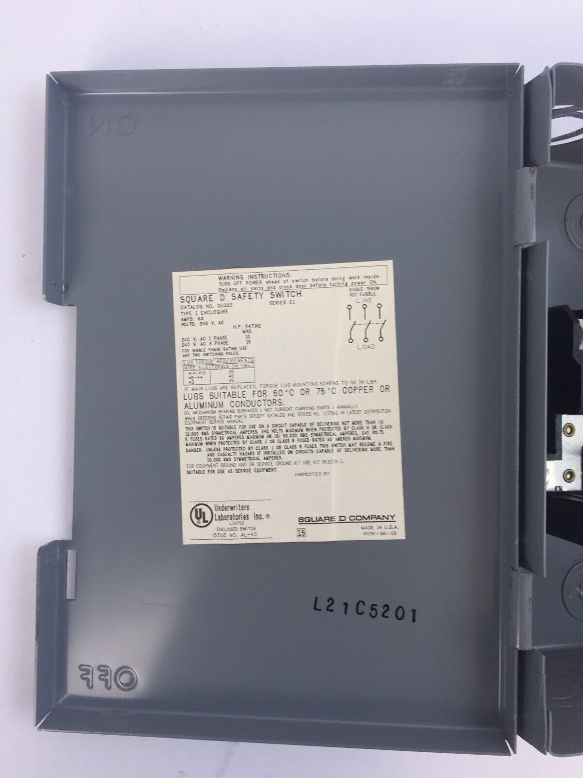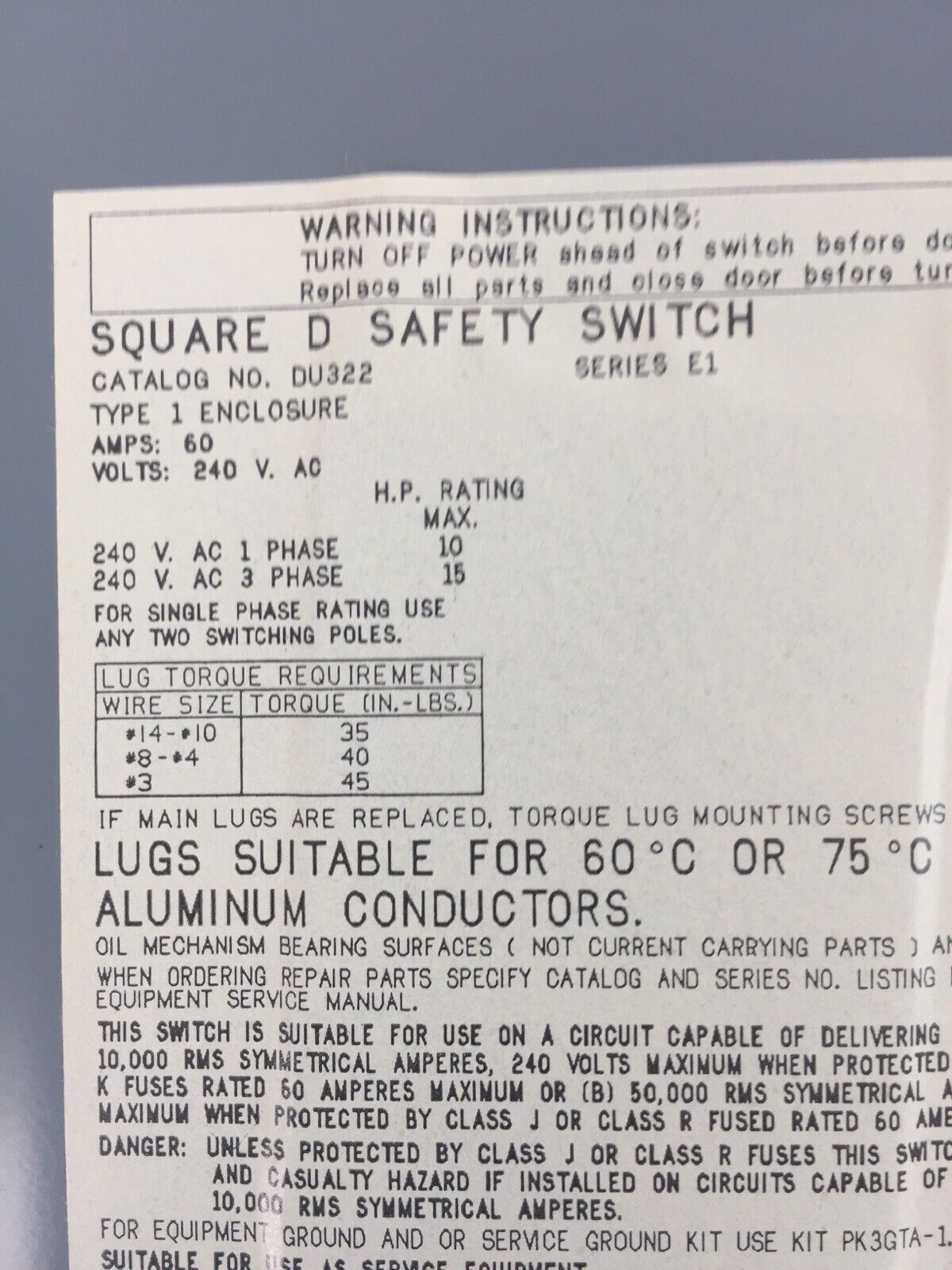 SQUARE D DU322 NON FUSIBLE SAFETY SWITCH 60A 240VAC SER E1 15HP 3PH TYPE 1
