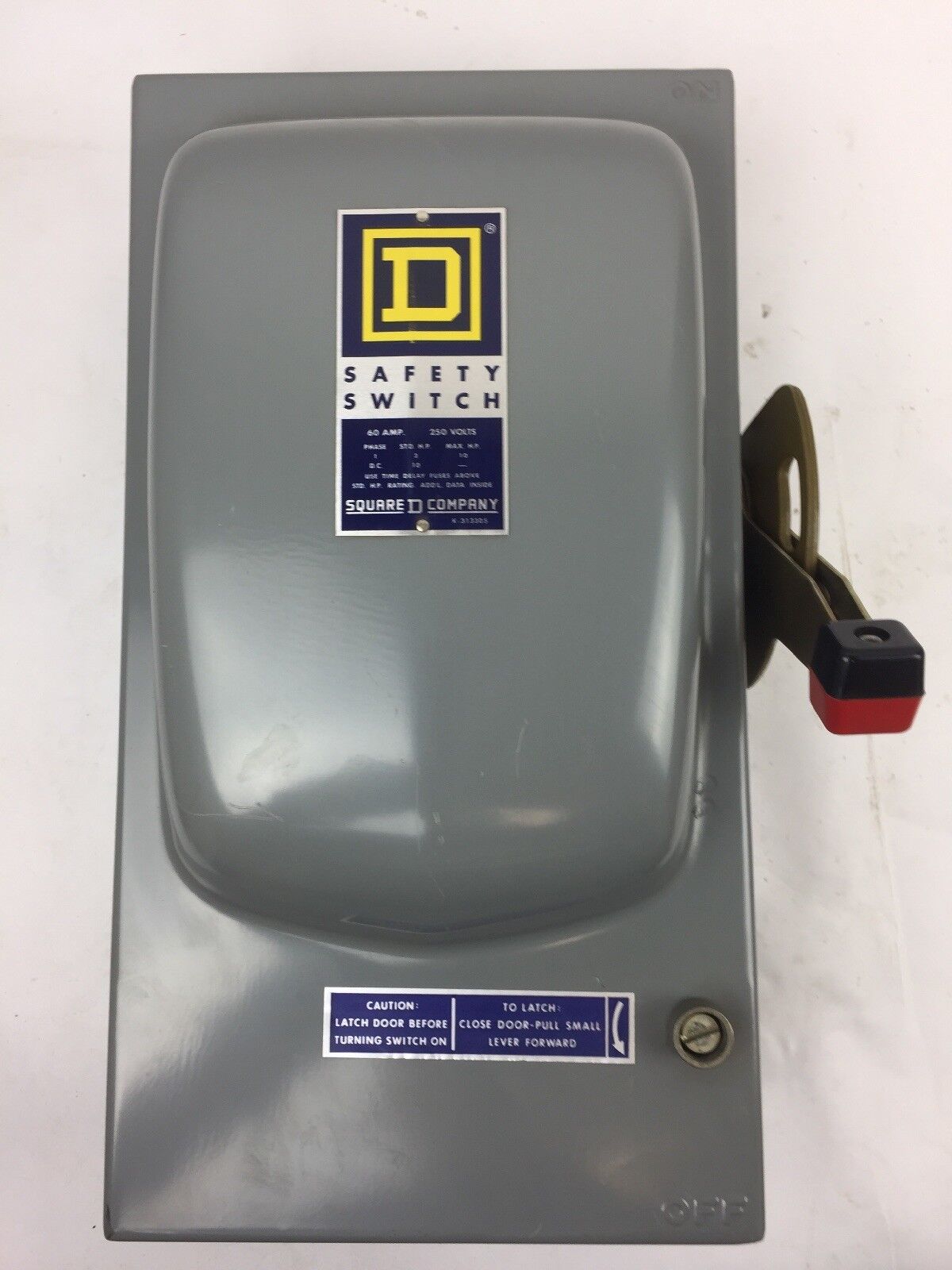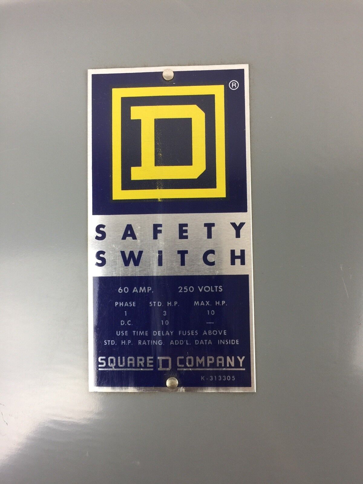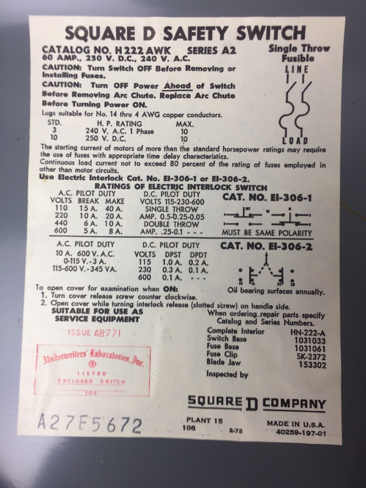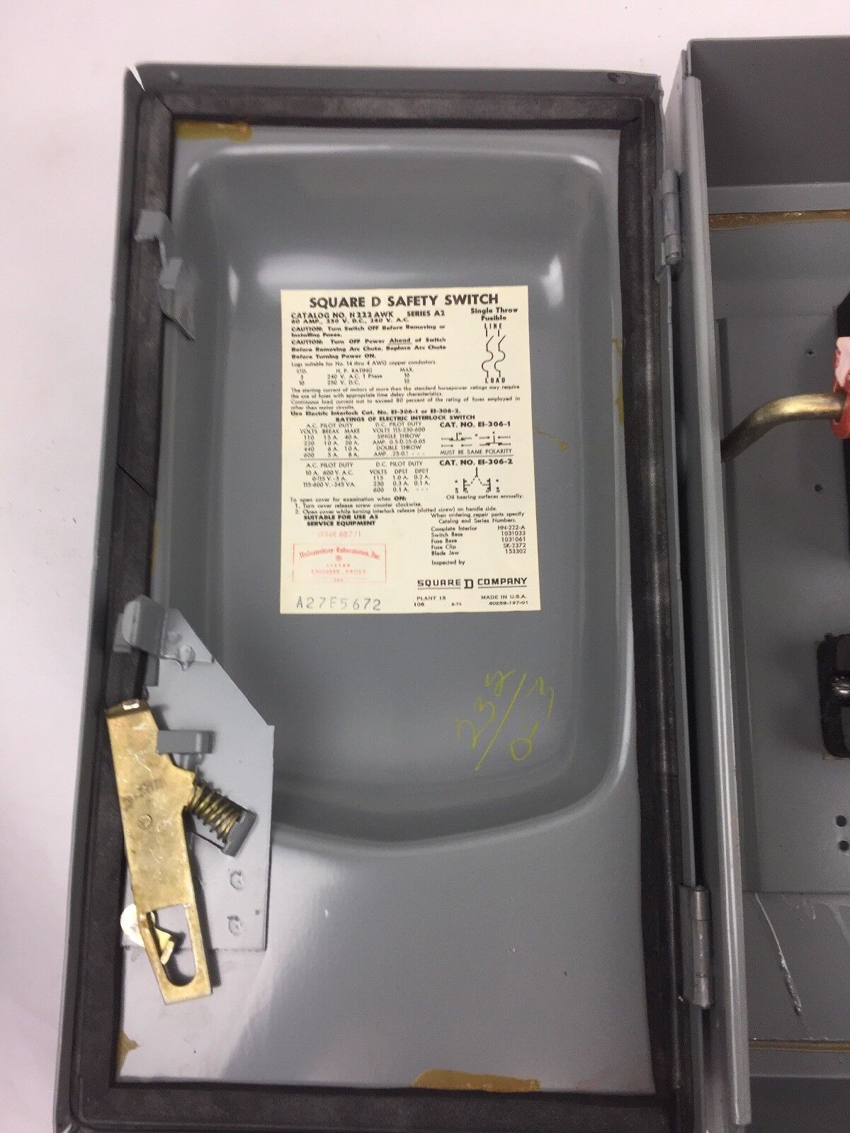 SQUARE D H-222AWK HEAVY DUTY SAFETY SWITCH 240 A.C. VOLTS 60 AMPS 250 D.C. VOLTS