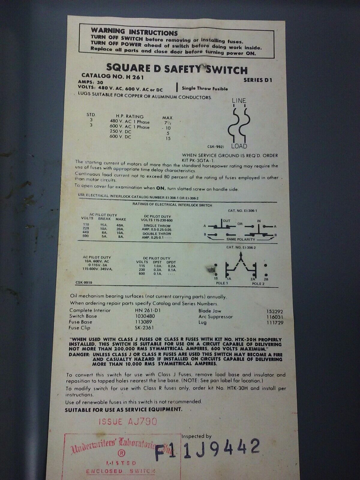 Square D H-261, H261, SER. D1, SAFETY SWITCH, FUSIBLE, 30A, 600V, 2 POLE, NEW