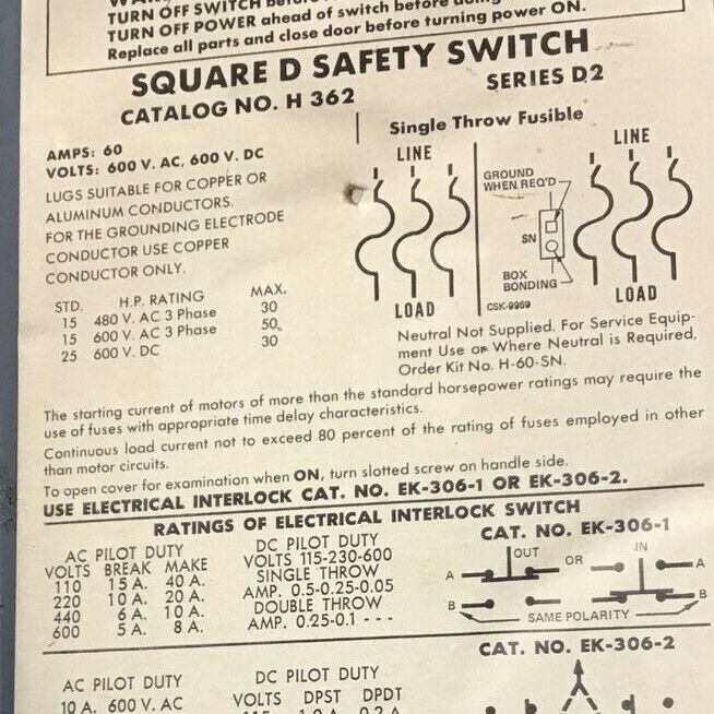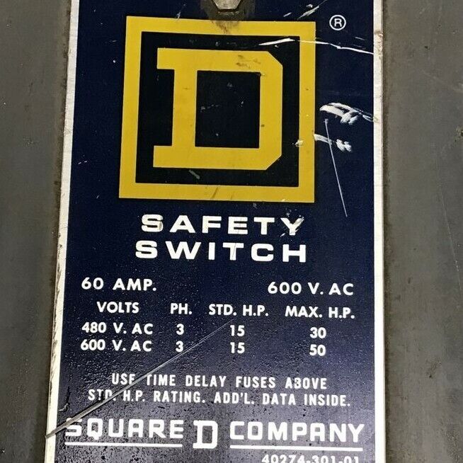 SQUARE D H362 SAFETY SWITCH 600VAC/DC 60AMP SER.D2 FUSIBLE 3PHASE