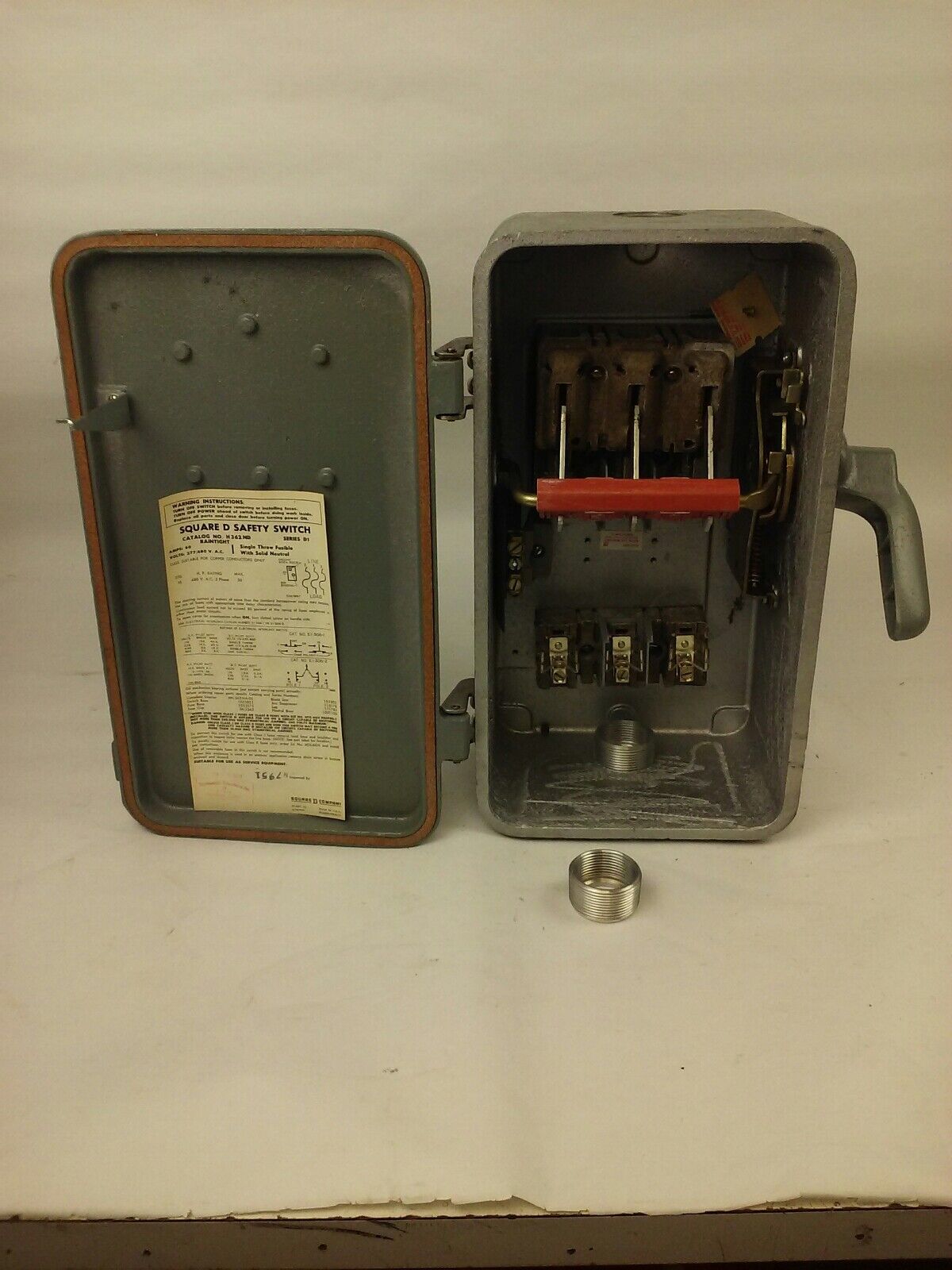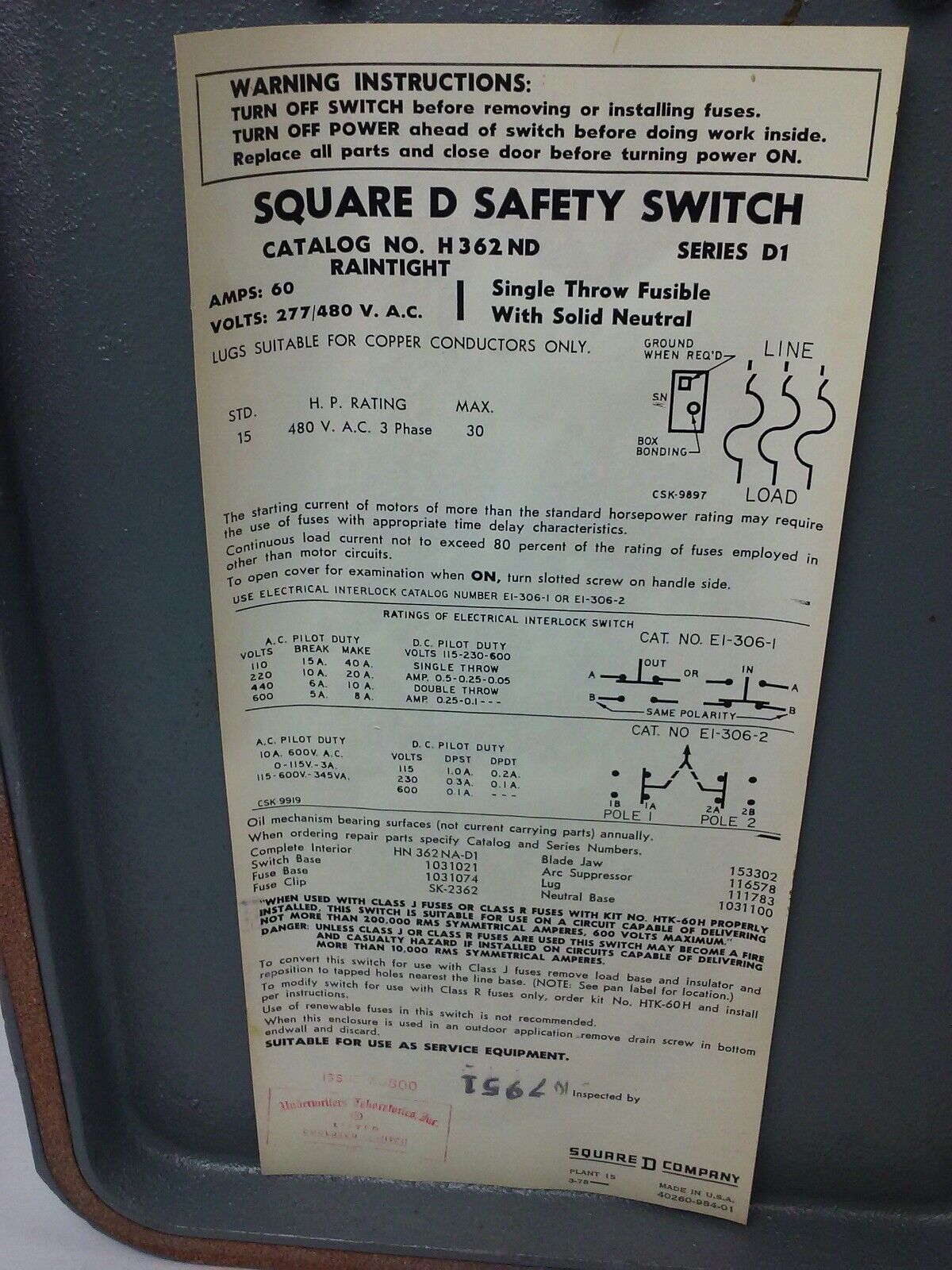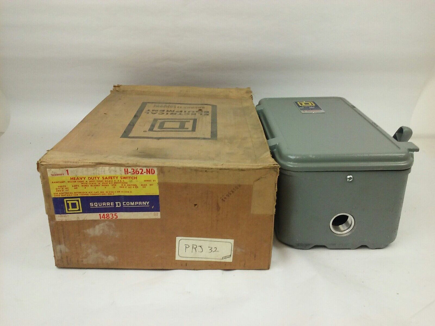 SQUARE D H362ND, H-362-ND, SER. D1, H.D.SAFETY SWITCH, MISSING LOCKING LATCHES AS PICTURE SHOWS!!!!!!!! 60A, 277/480V, 4 WIRES, 3 BLADES, 3 FUSES, STD. 15, 3PH, SINGLE THROW FUSIBLE W/ SOLID NEUTRAL, RAINTIGHT- WATER TIGHT- DUST TIGHT NEMA 3/4/5 W/ CLASS ''R'' FUSE KIT PROVISION, NEW