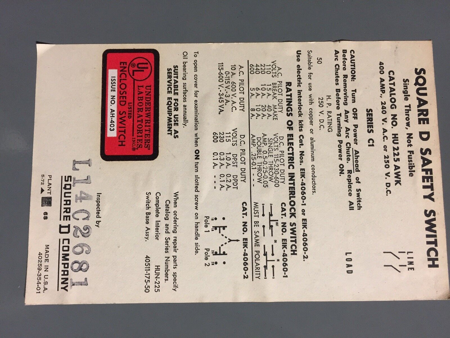 SQUARE D HU225AWK SAFETY SWITCH SINGLE THROW 400 AMP 240 VAC 250 VDC NOT FUSIBLE