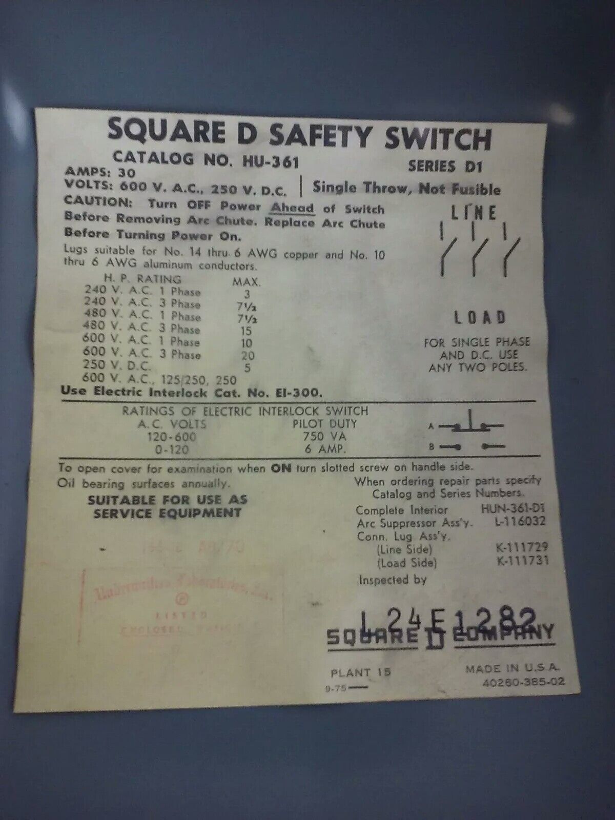 SQUARE D HU361 SER. D1 SAFETY SWITCH 30A 600VAC 250VDC NON FUSIBLE INDOOR
