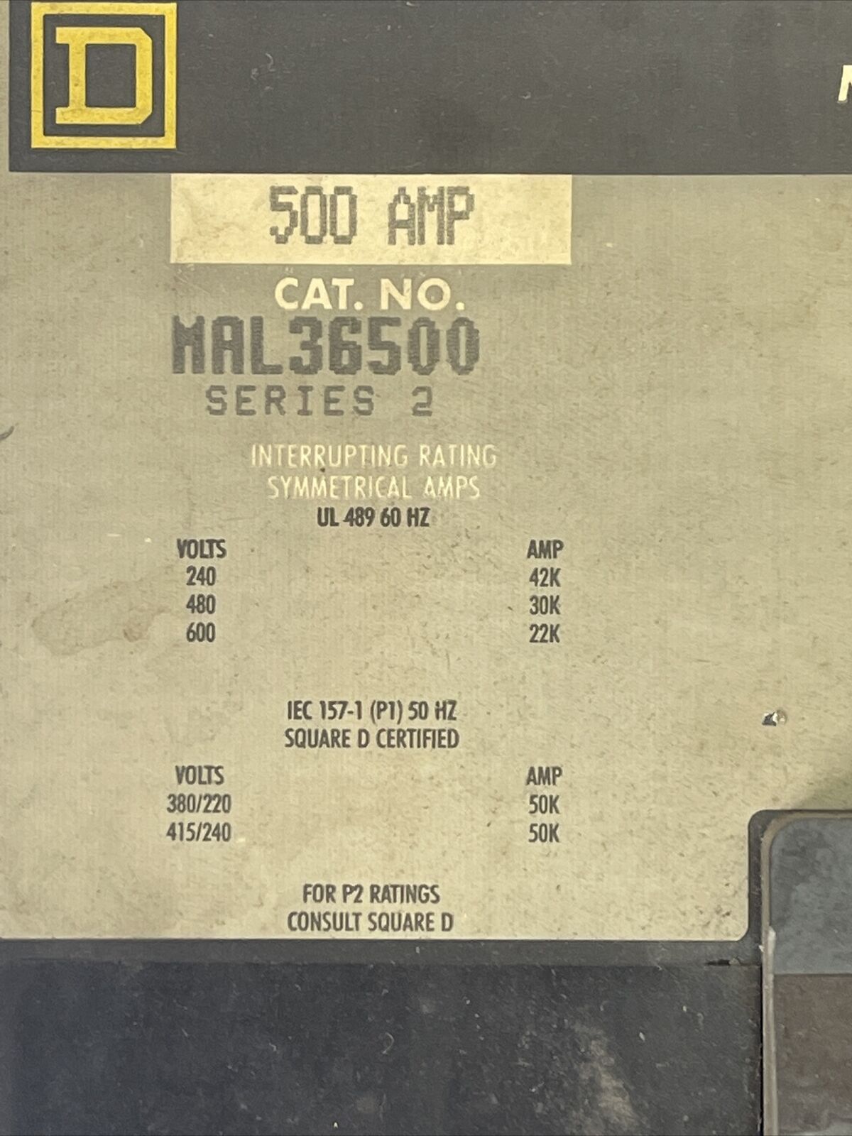 SQUARE D MAL36500 MOLDED CASE CIRCUIT BREAKER 500AMP 600VAC 250VDC 3P SER 2
