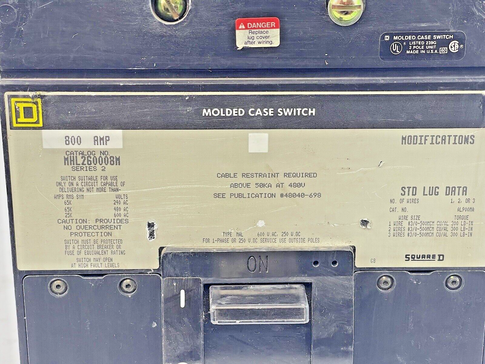 SQUARE D - MHL260008M SERIES 2 - CIRCUIT BREAKER - 800 A, 480 VAC, 3 POLE