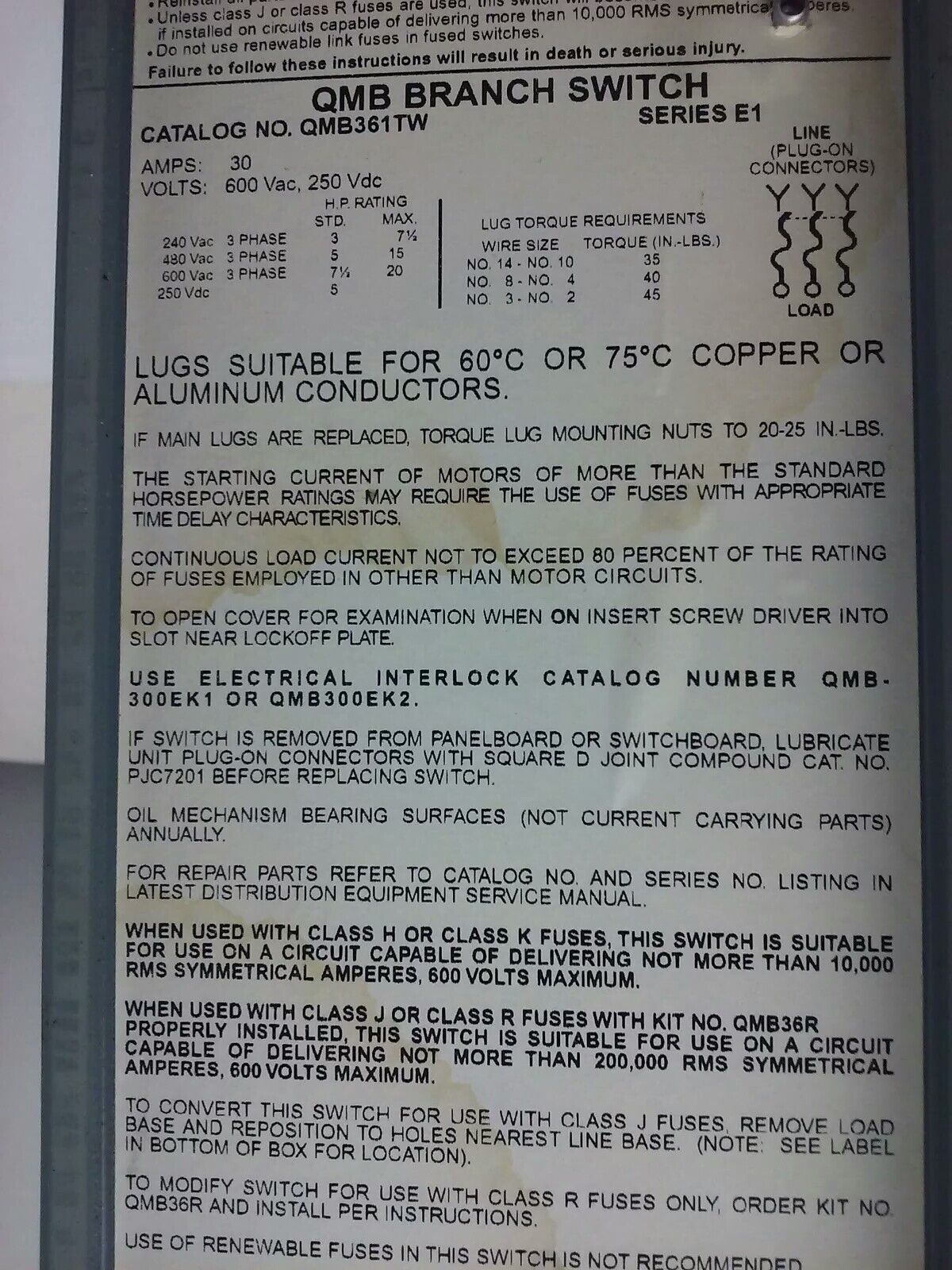 SQUARE D QMB361TW SERIES E1, TWIN PANELBOARD FUSIBLE SWITCH, 30A, 600VAC/250VDC, 3P, 20HP