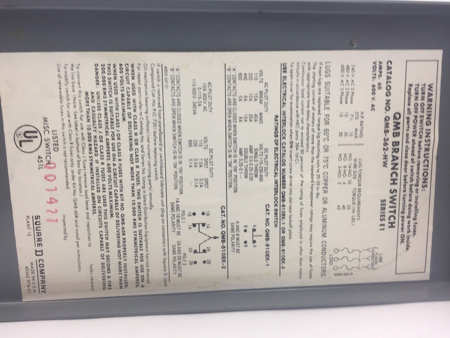 SQUARE D QMB362HW PANEL BOARD SWITCH 60 AMP 3 POLE 600 VAC SER E1