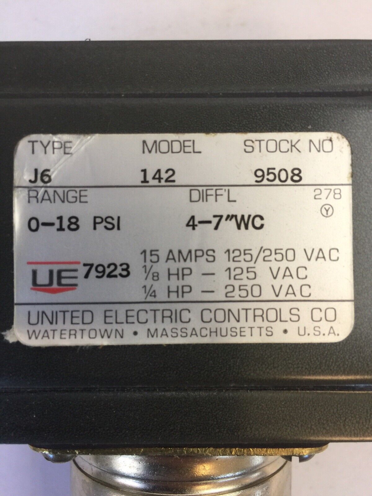 UNITED ELECTRIC J6 9508 142 PRESSURE SWITCH 15A 125/250VAC 1/8HP 125VAC 1/4HP 250VAC RANGE 0-18PSI DIFF'L 4-7"WC