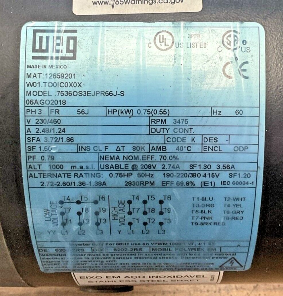WEG .7536OS3EJPR56J-S PUMP 0.75HP 3475RPM FR 56J 230/460V 2.48/1.24A