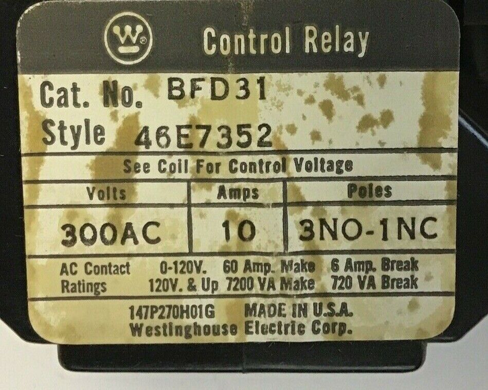 WESTINGHOUSE BFD31 CONTROL RELAY 300AC 10AMPS 3NO-1NC
