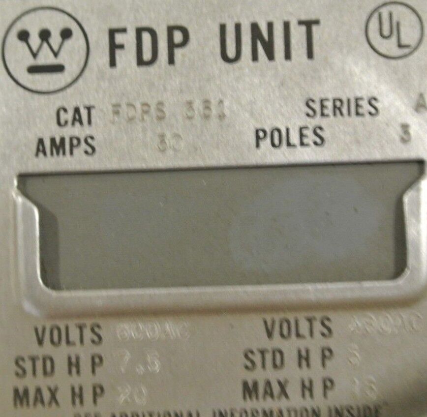 WESTINGHOUSE FDPS361 FUSIBLE PANEL MOUNT SWITCH - 600V, 30A, 3-POLE