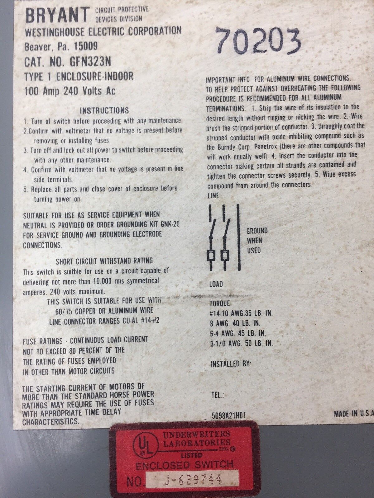 WESTINGHOUSE GFN323N SAFETY SWITCH 240 VAC 100 AMP TYPE 1 ENCLOSURE INDOOR
