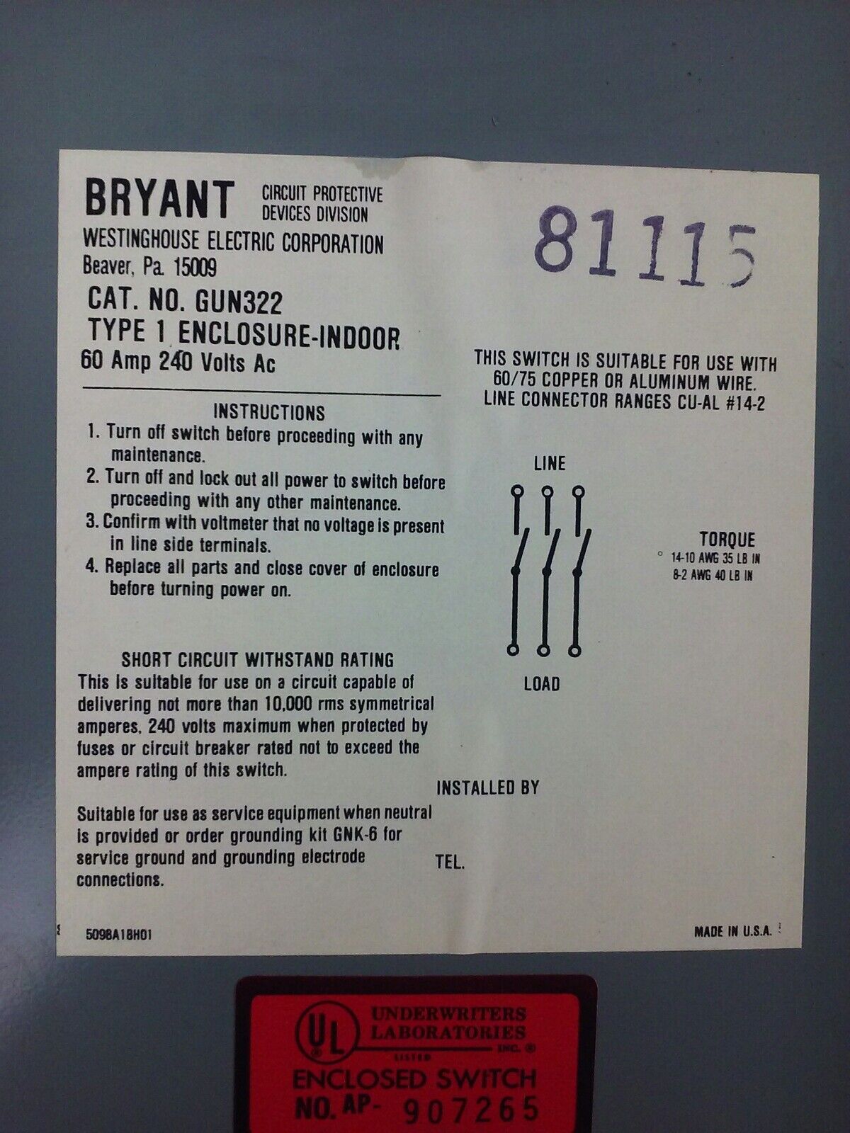 WESTINGHOUSE GUN322 60A, 240V, 3PH, NON FUSIBLE, TYPE 1 INDOOR ENCLOSURE, MAX HORSEPOWER 15-30, NEW