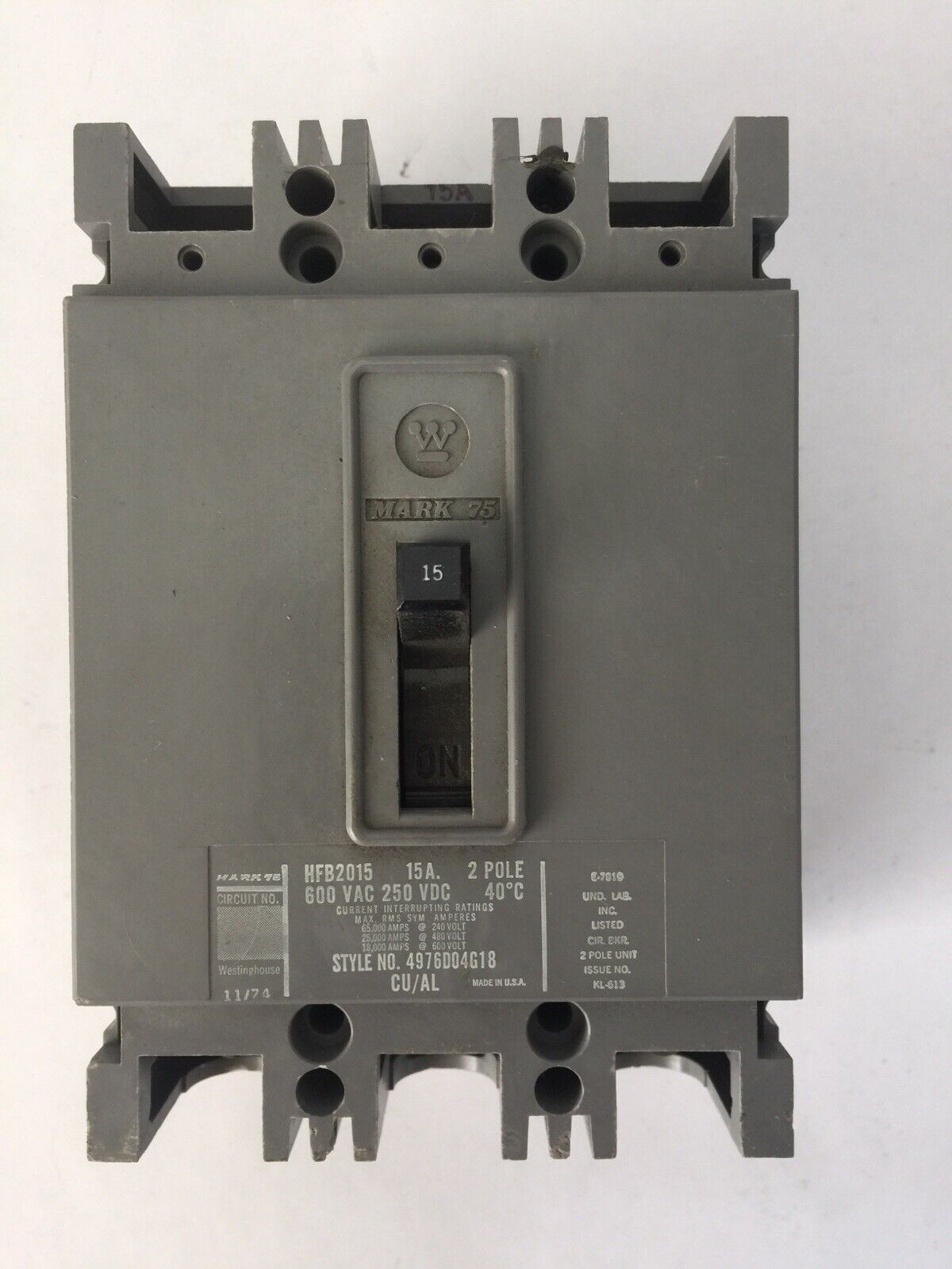 WESTINGHOUSE HFB2015 AB DE-ION CIRCUIT BREAKER 15AMP 600VAC 250VDC 2P 4976D04G18