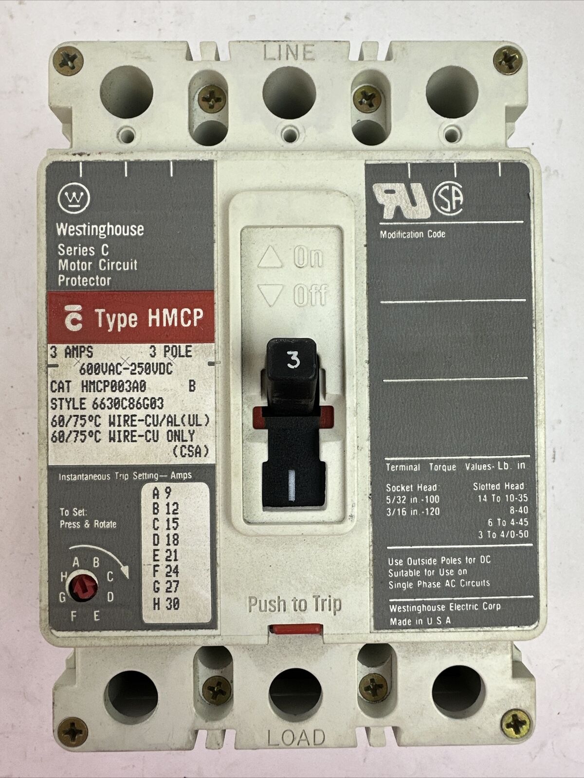 WESTINGHOUSE HMCP003A0 B SER C 3P 3AMP 600VAC 250VDC 6630C86G03 MOTOR CIRCUIT PROTECTOR