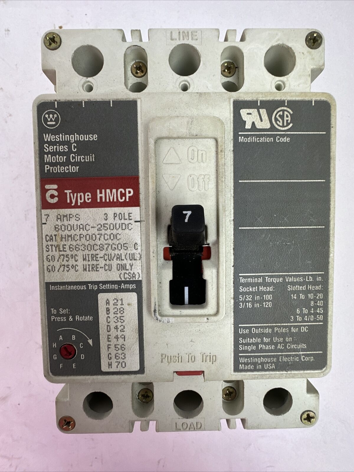 WESTINGHOUSE HMCP007C0C SER C 3P 7AMP 600VAC 250VDC 6630C7G05 C MOTOR CIRCUIT