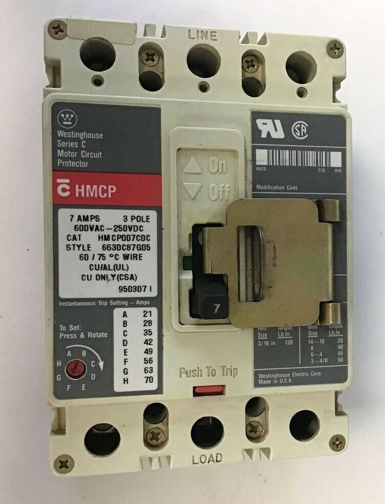 WESTINGHOUSE HMCP007CDC CIRCUIT BREAKER 7AMP 3POLE SER.C 600VAC 250VDC