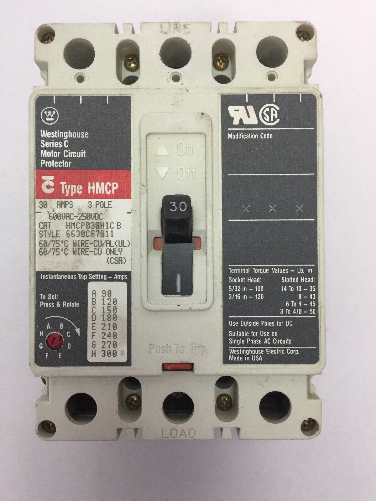 WESTINGHOUSE HMCP030H1C B 30AMP 600VAC 250VDC MOTOR CIRCUIT PROTECTOR SERIES C 3POLE