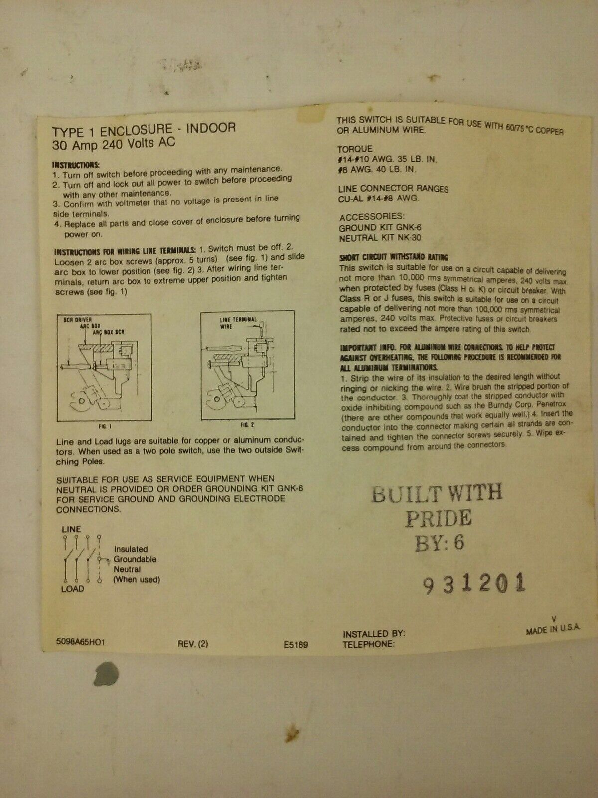 WESTINGHOUSE HUN321 SAFETY SWITCH INDOOR, 30A, 3P, 240V, NON FUSIBLE, NEMA 1