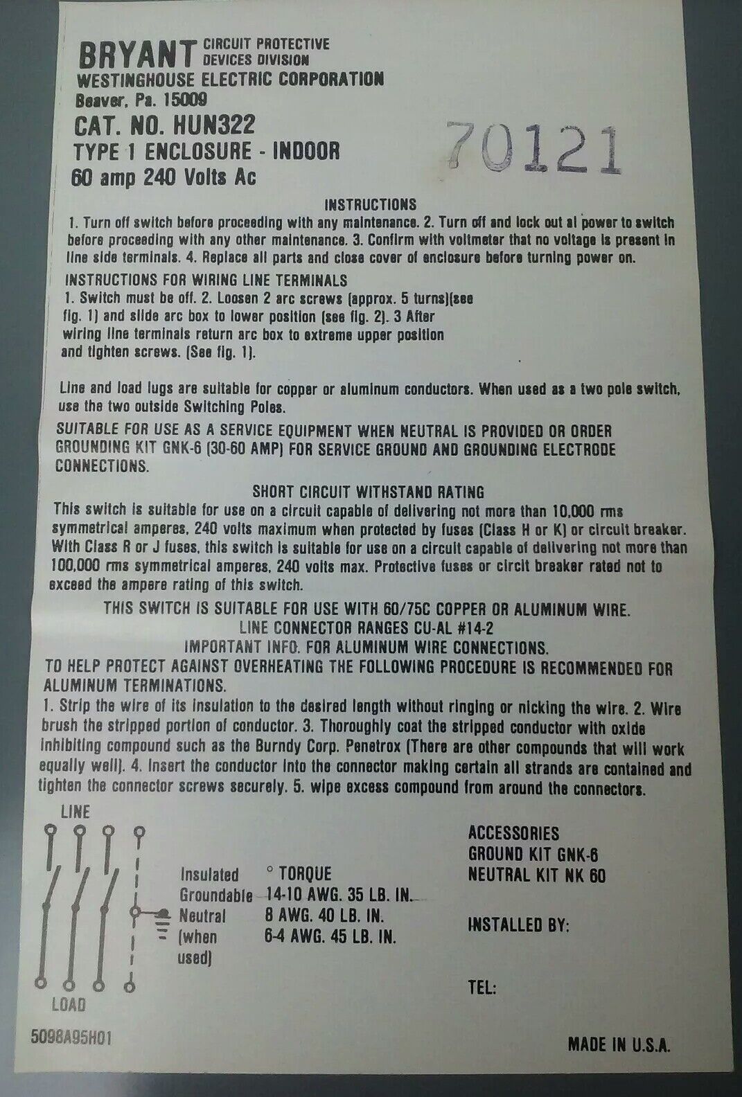 BRYANT WESTINGHOUSE HUN322 NON FUSIBLE HEAVY DUTY SAFETY SWITCH 3P, 60A, 15HP, 240VAC/250VDC, TYPE 1 ENCLOSURE INDOOR