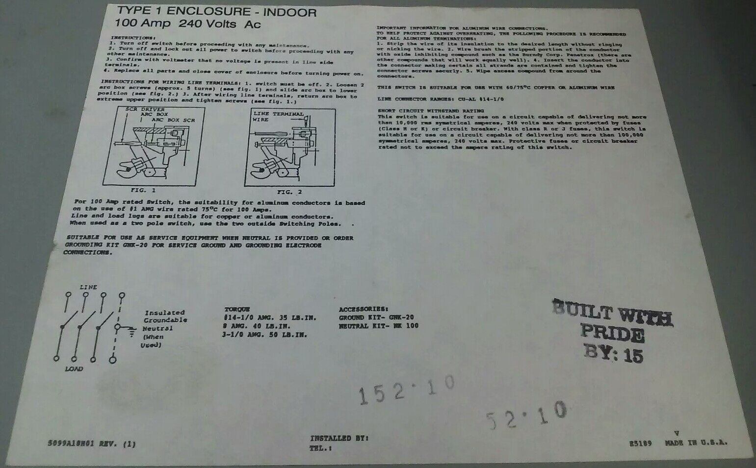 WESTINGHOUSE HUN323 NON FUSIBLE SAFETY SWITCH 100A 240V 3PH 30HP TYPE 1 INDOOR