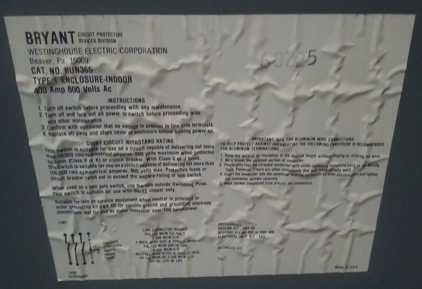WESTINGHOUSE HUN365 NON-FUSIBLE SAFETY SWITCH, 400A, 600V, 3PH, 350HP, TYPE 1