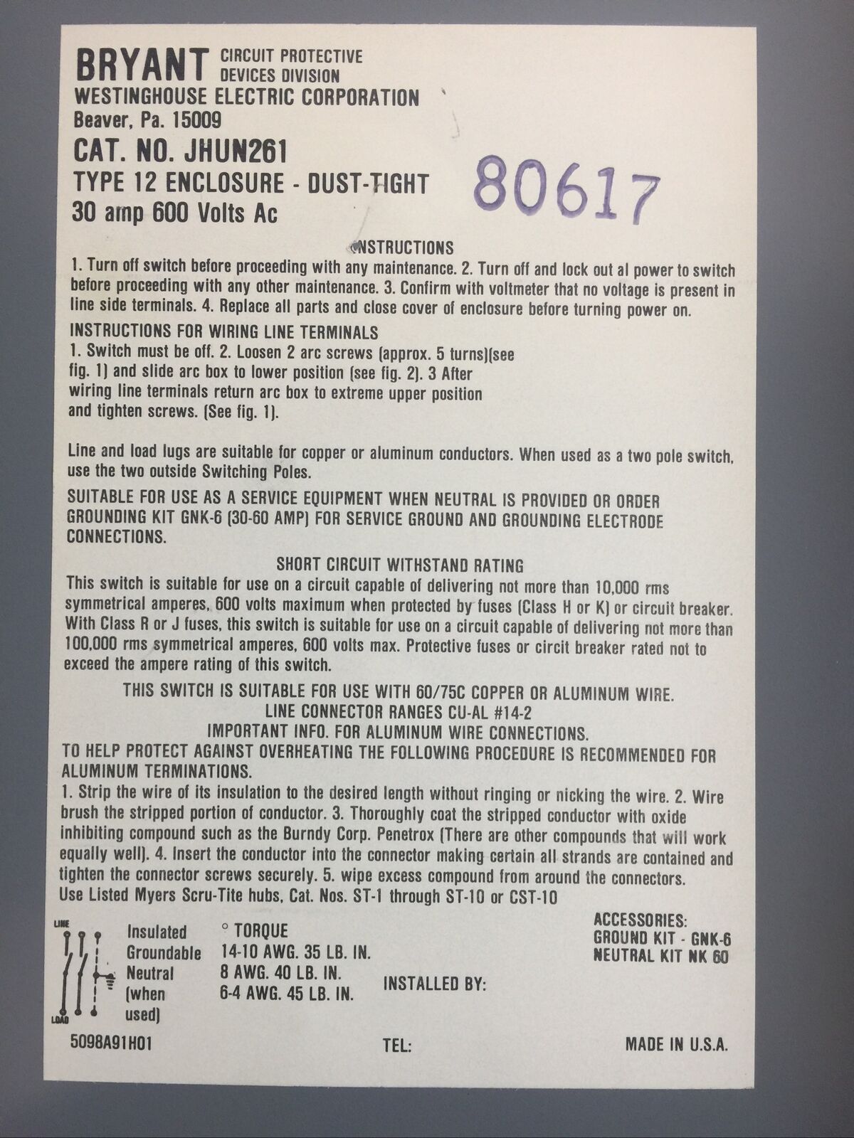 WESTINGHOUSE JHUN261 NON FUSIBLE SAFETY SWITCH 600V 30A 15HP TYPE 12 DUST-TIGHT
