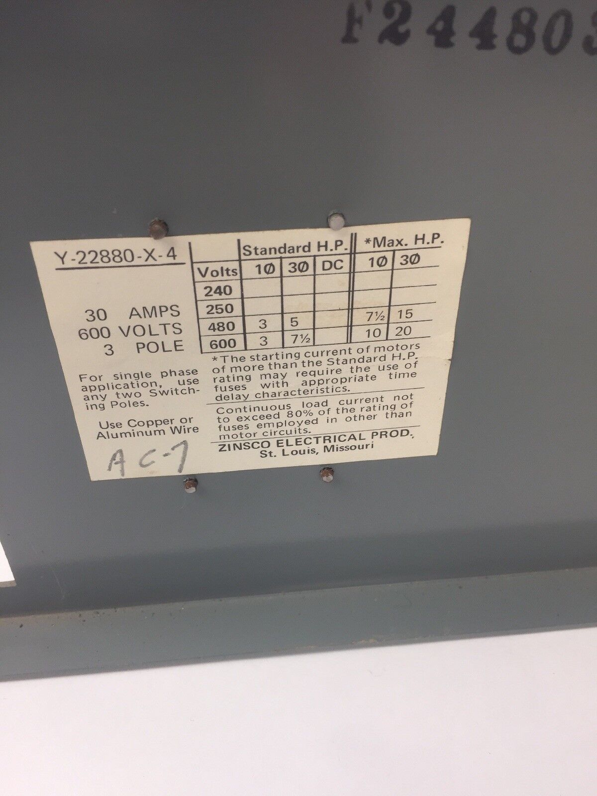 ZINSCO QSFT353B TWIN PANELBOARD FUSIBLE 30AMP 600VAC 3 POLE 7 1/8 HP